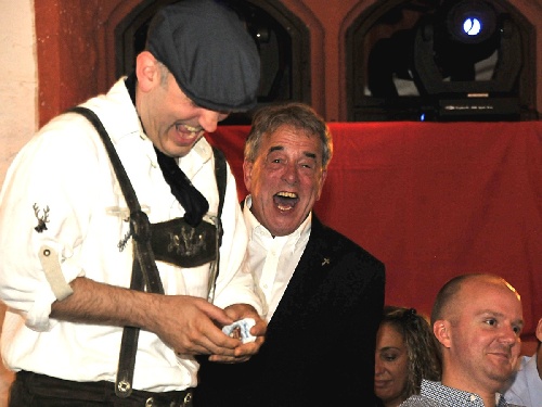 Pfarrer Kofler und Quirin sind ebenfalls in bester Laune. Was hält Quirin in den Händen?