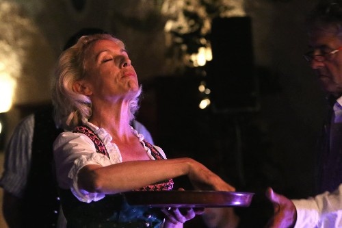 Amalie Anzengruber (Dimitra Papadopoulou) zieht aus den richtigen Lösungen den Gewinner der edlen Flasche ''San Simone''.