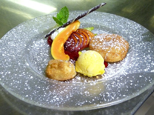 Apricot and apple cake dusted wth cinnamon sugar on a raspberry sauce with mango ice cream.