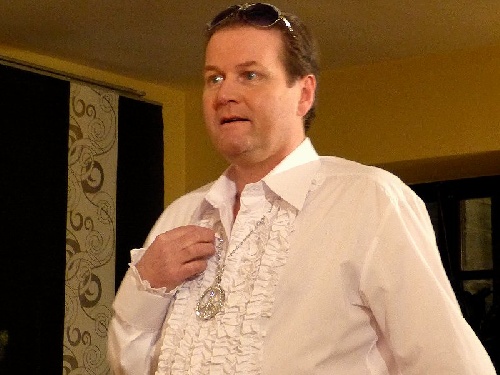 Georg (Jorg) von Laudenbach hat sich in seine 70er-Jahre Klamotten geschmissen. Er ist in der Midlife Crises und möchte Simone beeindrucken.