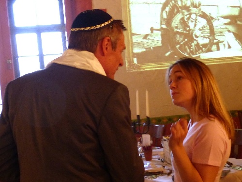 Rabbi Blumenfeld unterhält sich angeregt mit Rebekka.