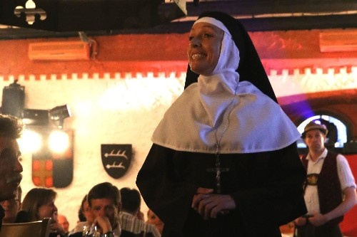 Das eigentliche Sakraldinner beginnt. Äbtissin Clara (Dimitra Papadopoulou) begrüßt die Gäste aus dem Wurzental.