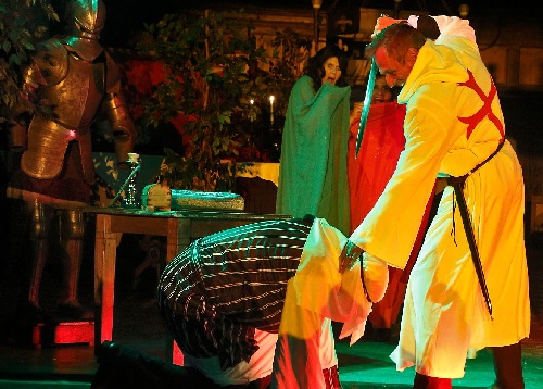 Im Jahre 1100 n.Ch.: Kreuzritter Theodor (Werner R. Gawlik) wirft im Schwertkampf Emir Abdullah (Manfred Beierl) zu Boden.