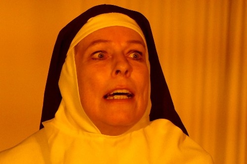 die fanatische Schwester Erika (Gabriele Misch) kurz vor der Abendgebetsstunde.