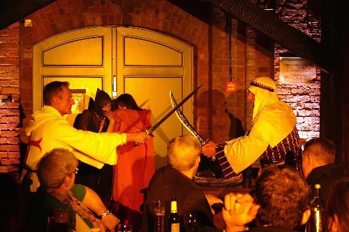 Plötzlich zieht Emir Abdullah (Manfred Beierl) seinen Krummsäbel. Theodor zückt das Schwert.