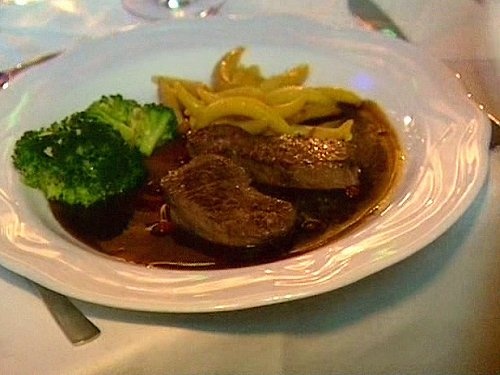 Der Hauptgang: Medaillon eines abgestochenen Hirsches mit Röschen aus paradiesischem Brokkoli und benediktinischen Schupfnudeln.