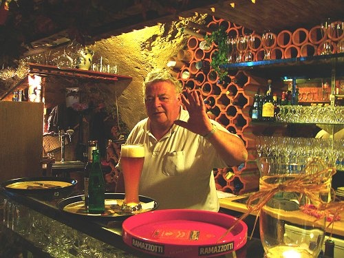 Jürgen, der Wirt im Strissel begrüsst die Krimi-Gäste.