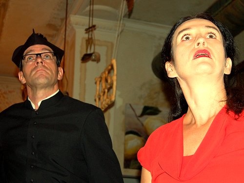 Der Gastgeber des Sakraldinners, Priester Don Carmelo, und Elda schauen gespannt nach oben. Was sehen die beiden?