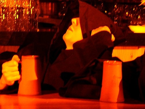 Zum Abschied von Bruder Jakob trinken die Mönche noch ein gutes bayrisches Kloster-Bier. Dieser Mönch hat etwas zu tief in den Krug geschaut.
