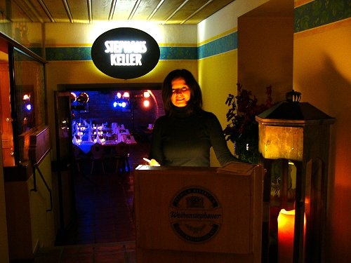 Judith Mészáros, die Produzentin, begrüßt die Gäste zur Premiere im Stephanskeller im Bräustüberl in Weihenstephan.