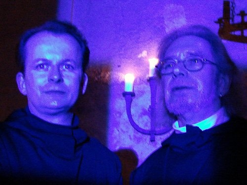 Was hecken die beiden Mönche aus? Und warum stehen sie im grellen blauen Licht?