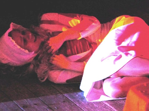 Henning schlägt Hildegund. Sie fällt zu Boden.