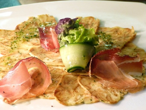 Bread dumpling carpaccio with chives lime vinaigrette, slices of Tyrolean premium bacon and a small salad bouquet in a mustard herbal dressing.