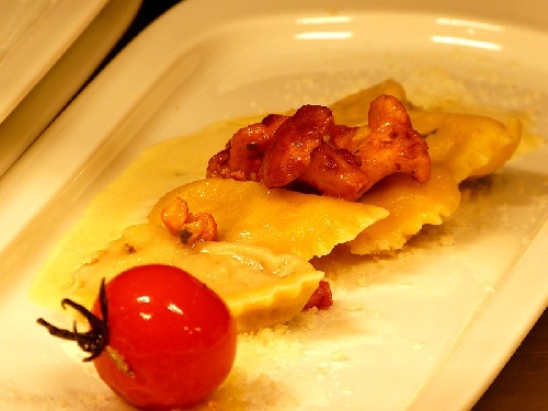 Mezzelune (half moon ravioli) filled with roasted chanterelles and bacon on a rosmary cream sauce and freshly shaved Parmesan.