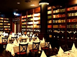Dunkles Holz, blütenweiße Tischdecken, hohe Bibliothek-Regale, gedimmtes Licht und Kerzenschein bieten jedem Gast beim Eintritt sofort ein besonderes Wohlfühl-Ambiente.
