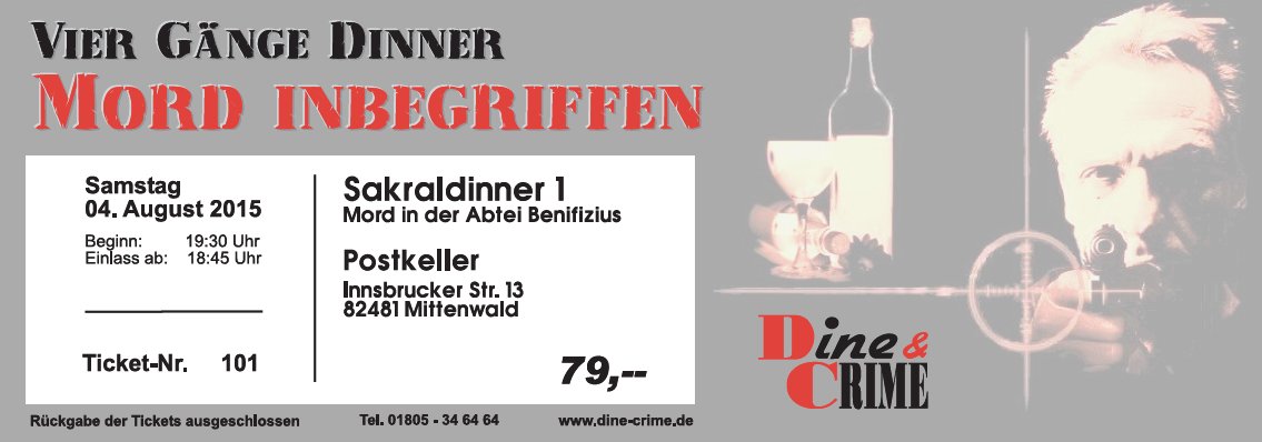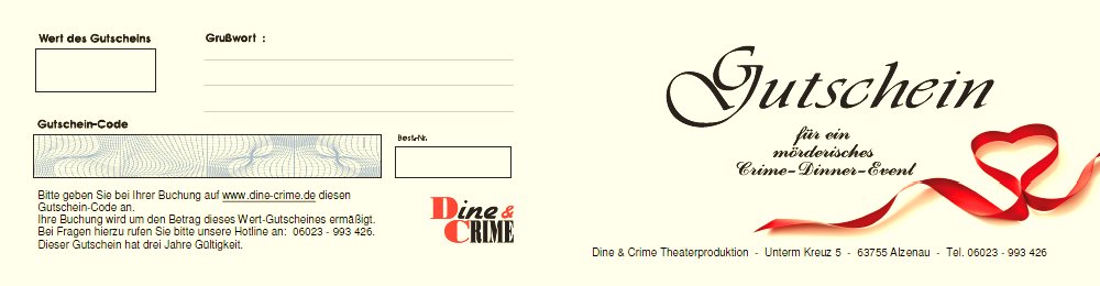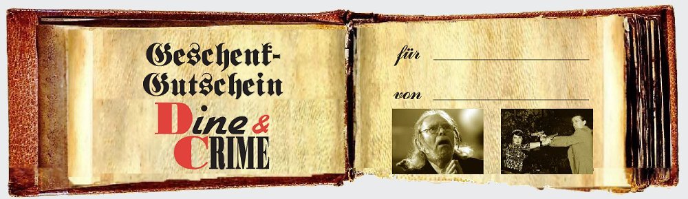 Sie möchten Ihren Liebsten und Freunden eine große Freude bereiten und sie zu einem spannenden Crime-Dinner einladen. Sie wissen aber noch nicht, wann und zu welchem Stück die Beschenkten kommen möchten. Dann verschenken Sie einen Wert-Gutschein. Die Beschenkten suchen sich dann im Spielplan eine bestimmte Veranstaltung heraus und buchen diese. Die Buchung wird dann um den Betrag des Wert-Gutscheines ermäßigt.