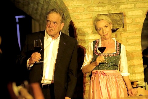 Der Produzent übergibt mit Amalie Anzengruber der Gewinnerin eine Flasche eines guten italienischen Tropfens.