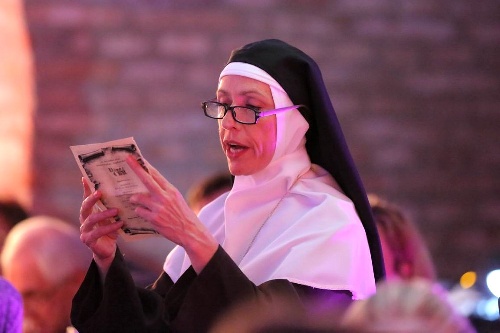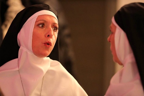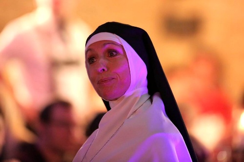 Die neu gewählte Äbtissin Clara (Dimitra Papadopoulou) begrüßt ihre Gäste zum Gospel-Abend.