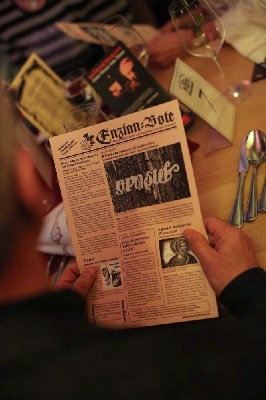 Beim Essen wird die neueste Ausgabe des ''Enzian-Boten'' ausgetragen, das lokale Tagblatt im Wurzental.