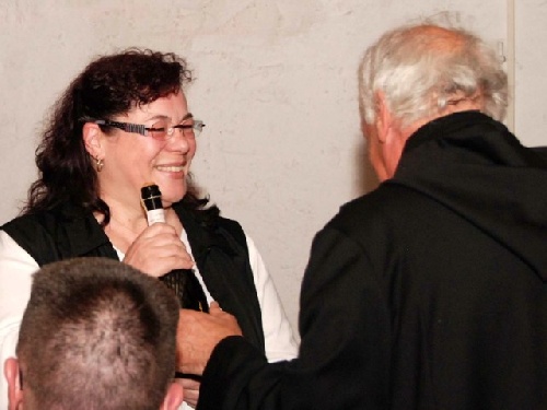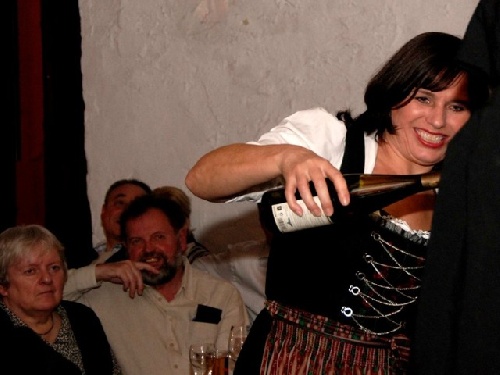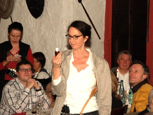 Auch Bürgermeisterin Barbara Braun bietet von ihrem Weißwein an. Sie trinkt ''Jungfräuliches Nonnentröpfchen''.