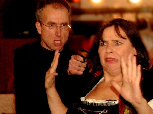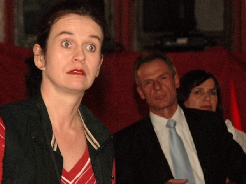 Werner R. Gawlik (Bankier Xaver Hinteregger) liest eine Beschuldigung der Gäste vor. Man hat die Bürgermeisterin verdächtigt!
